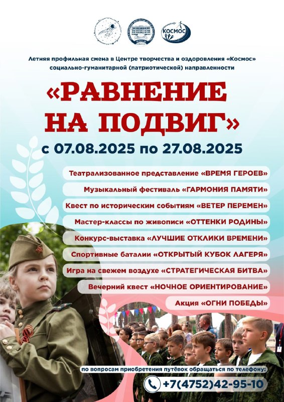 | Участники смены погрузятся в захватывающую и познавательную атмосферу, где мирное небо соединяется с необъятными полями и лесами, где живут дети, которые хранят память о своих предках. Каждый день участников смены будет тематическим и наполнен новыми яркими событиями и активностями: квестами, интеллектуальными играми, мастер-классами, встречами с интересными людьми, интерактивами, фотомаршрутами, флешмобами, соревнованиями и конкурсами. В комплекс мероприятий включены: театрализованное представление, посвященное подвигам солдат «Время Героев», музыкальный фестиваль «Гармония Памяти», квест по историческим событиям «Ветер перемен», мастер-классы по живописи «Оттенки Родины», конкурс-выставка рисунков и плакатов, посвященных войне и миру «Лучшие Отклики Времени», спортивные баталии «Открытый кубок лагеря», игра на свежем воздухе с конструкциями из подручных материалов, где участники могут создавать свои базы и защищаться от «врагов» «Стратегическая битва», вечерний квест с фонариками, контрольными точками с заданиями и загадками «Ночное ориентирование», акция «Огни Победы» |