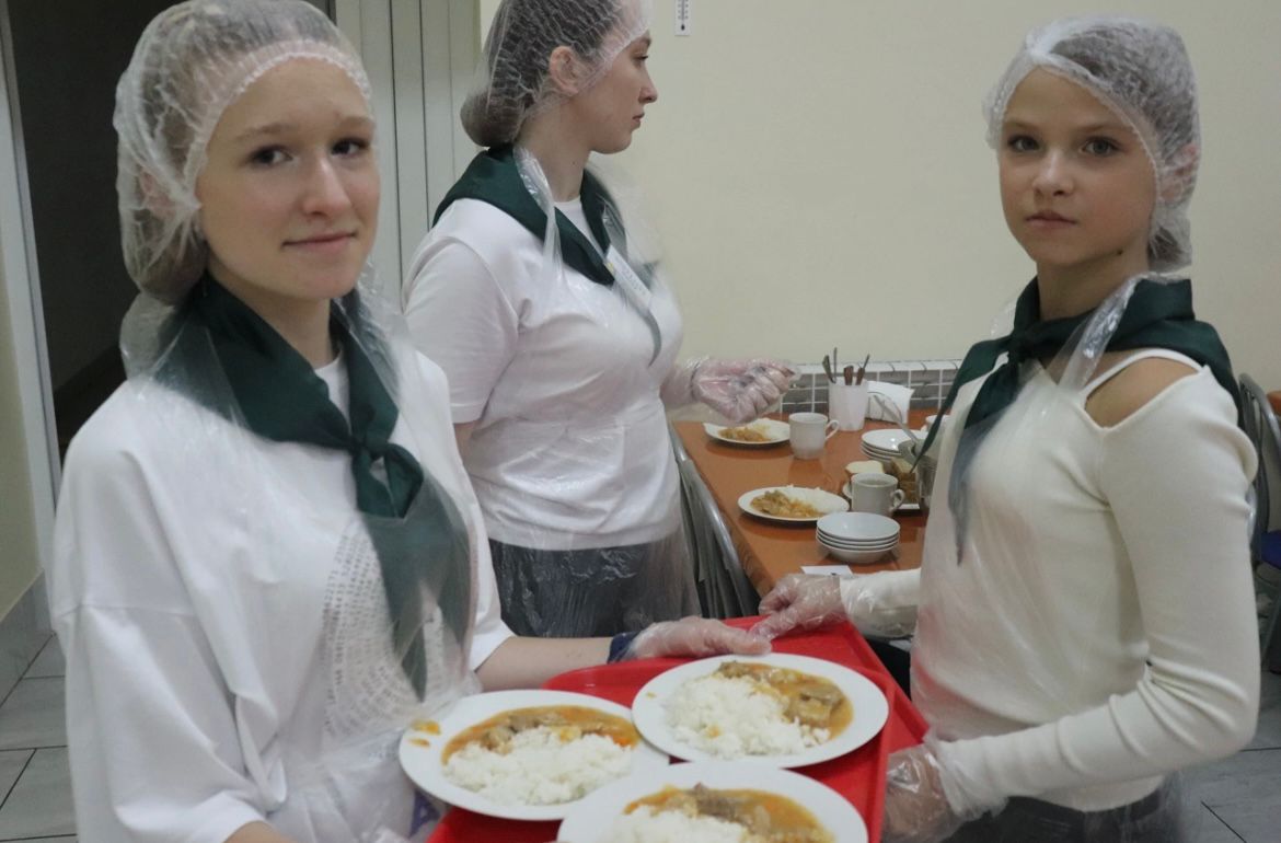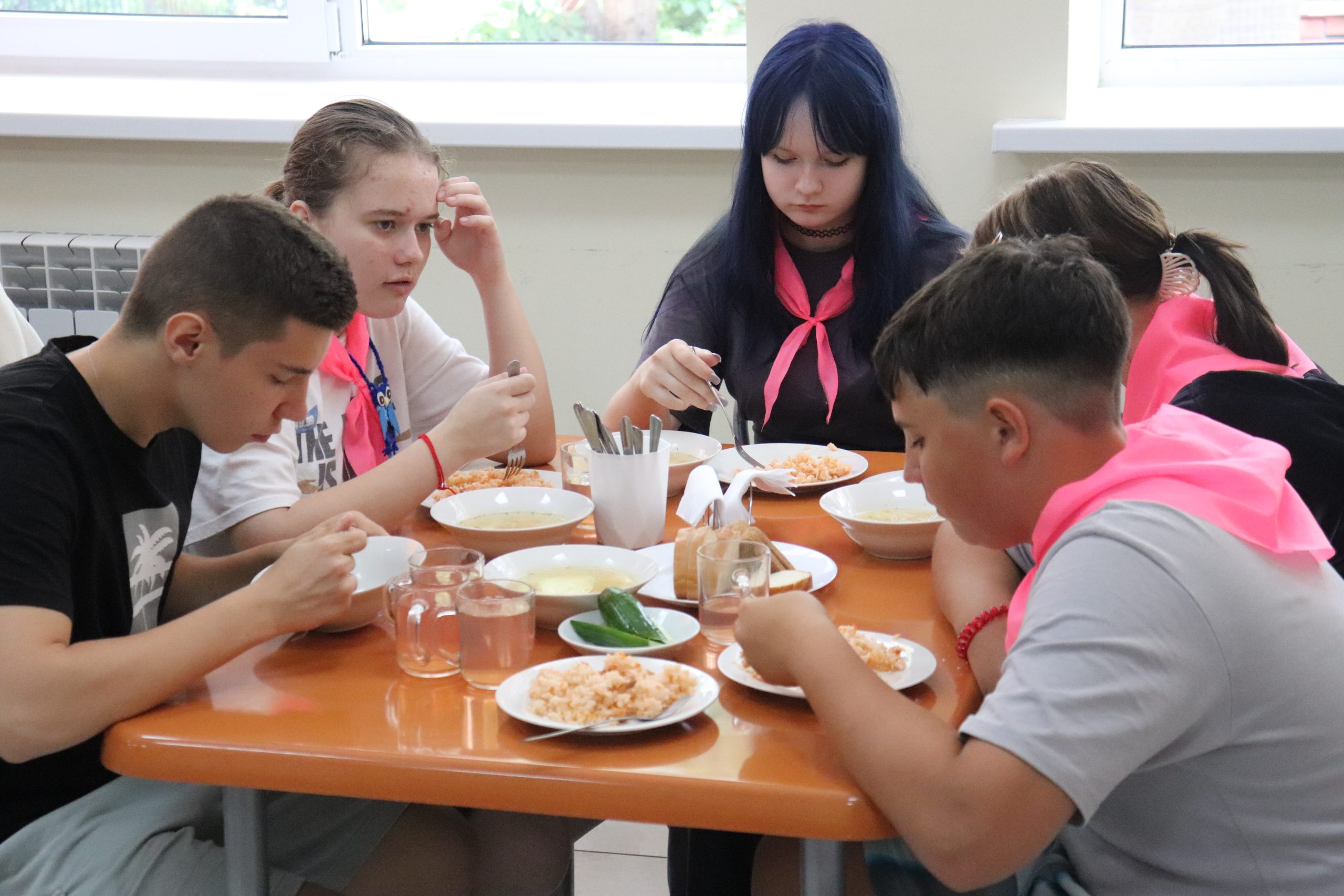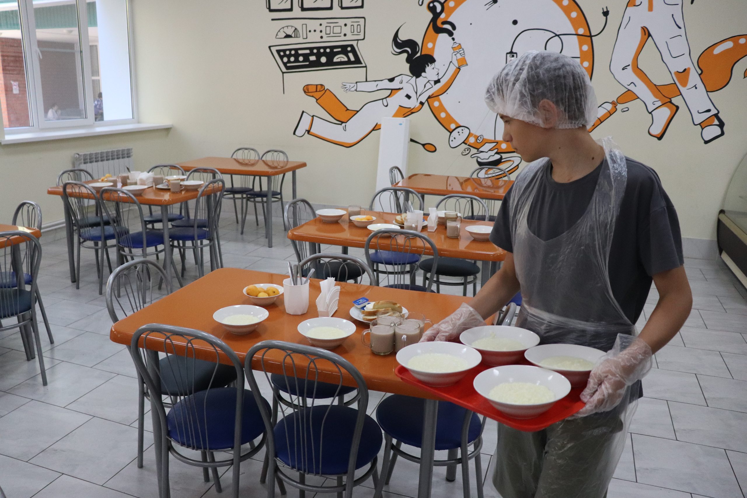 столовая – обеденный зал (проектная мощность – более 90 человек), сбалансированное пятиразовое питание осуществляется в два потока.