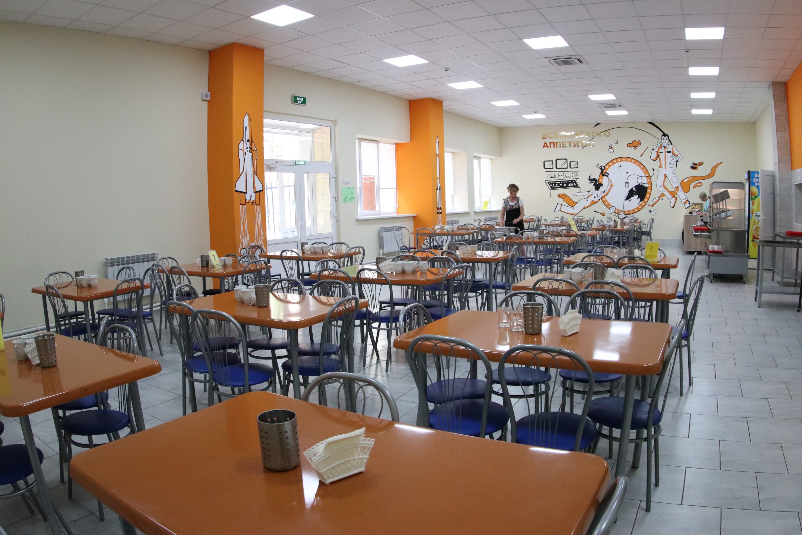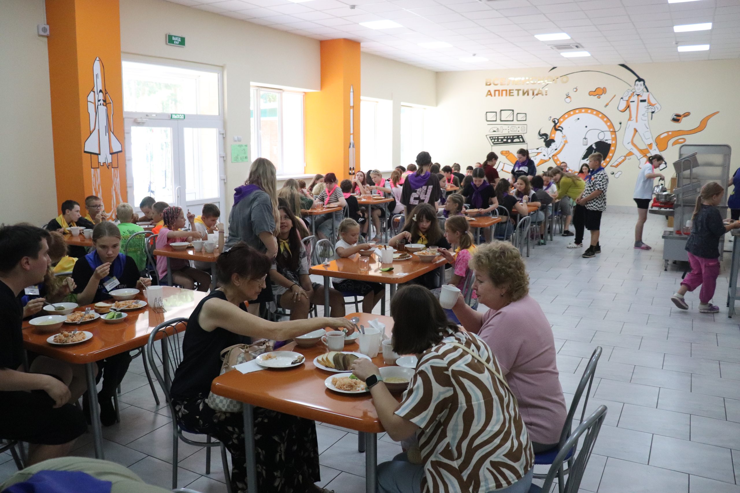 Также на 1 этаже расположена столовая (предусмотрено пятиразовое питание обучающихся), которая включает в себя обеденный светлый зал с современной мебелью и дизайн, соответствующий названию лагеря, зал на 95 посадочных мест, и производственные цеха, оснащенные современным технологическим оборудованием, позволяющим применять технологии здорового питания. Во время заезда детей работает буфет.